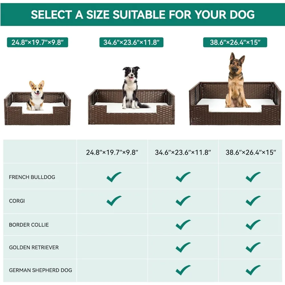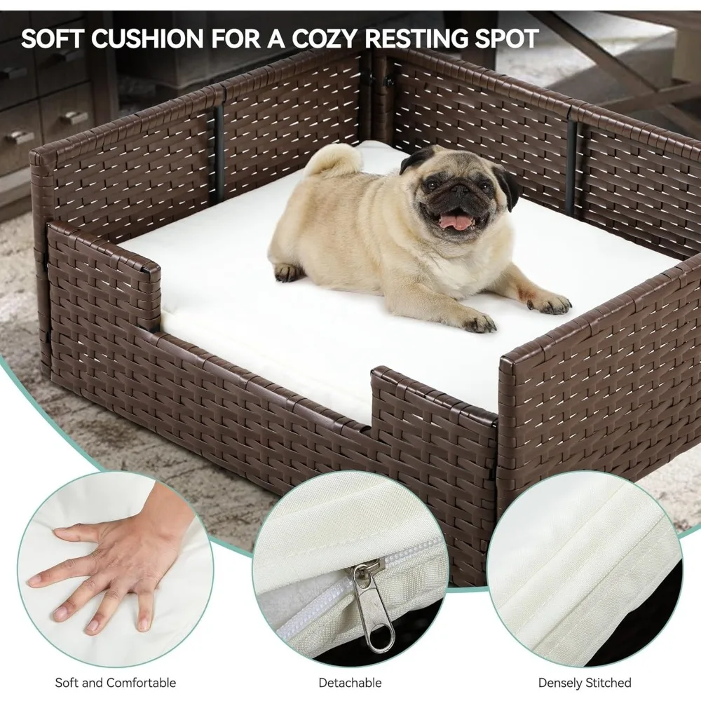 Handwoven Rattan Dog Sofa Bed with Cushion – Indoor/Outdoor/ Water Resistant for Small to Large Dogs